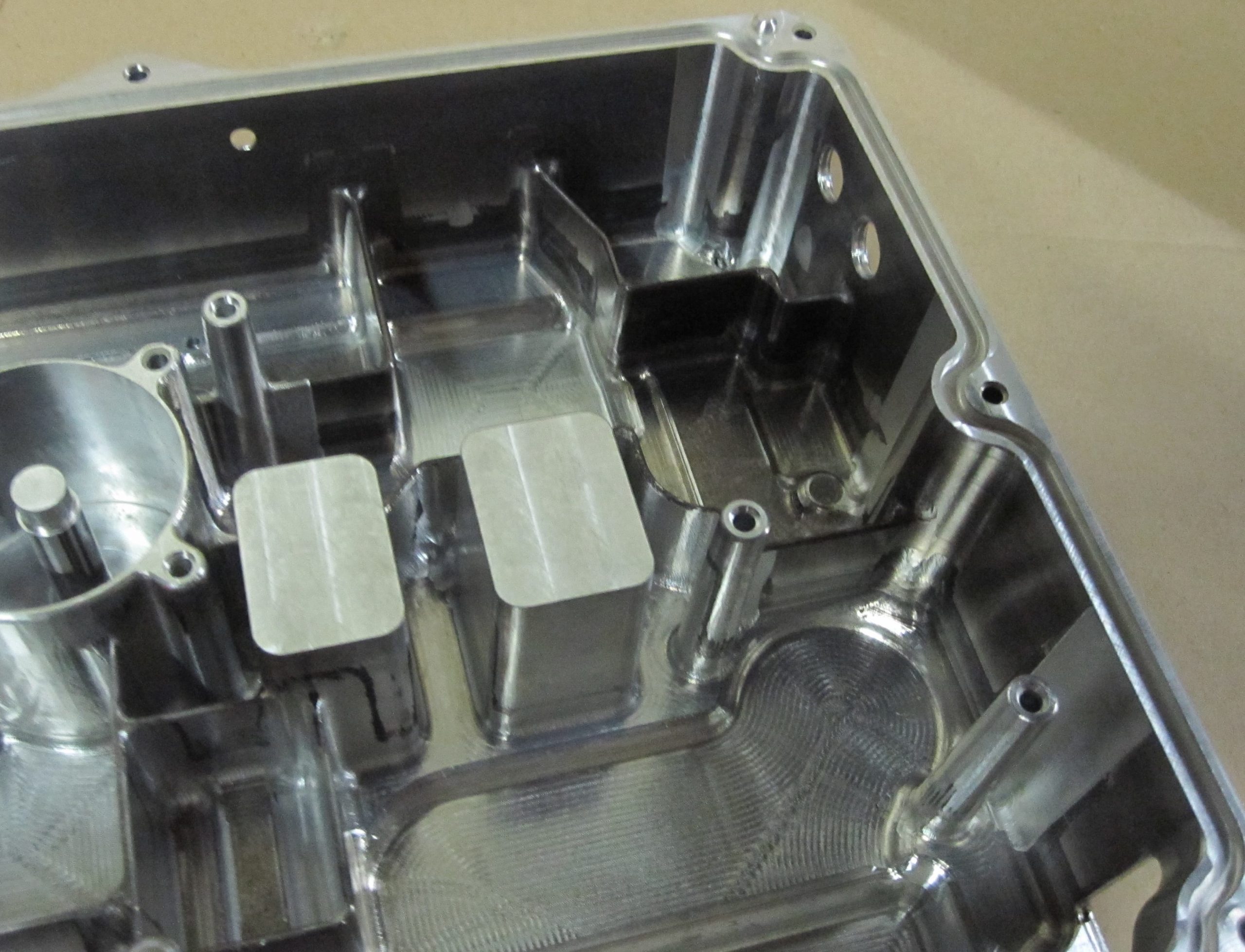 • Die beiden Taschen im Zentrum haben, beim genaueren Betrachten, scharfkantige Ecken. Wodurch ein rotierendes Werkzeug mit Radius nicht benutzt werden könnte. Diese Taschen wurden senkerodiert.